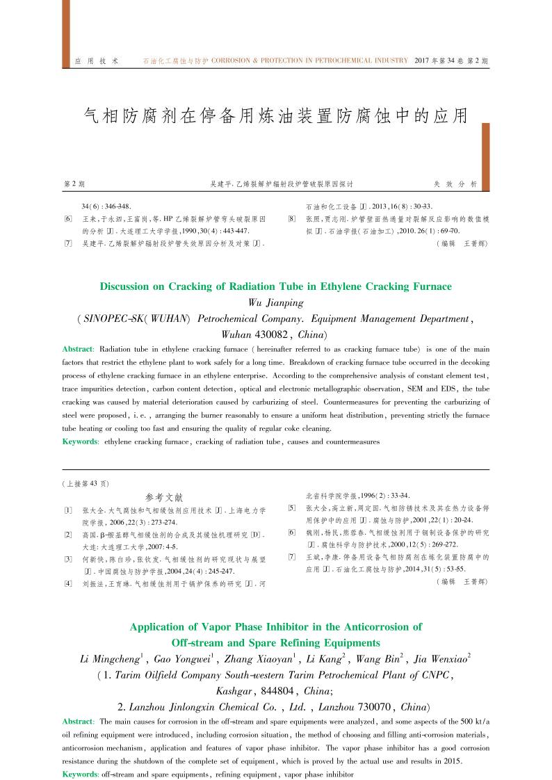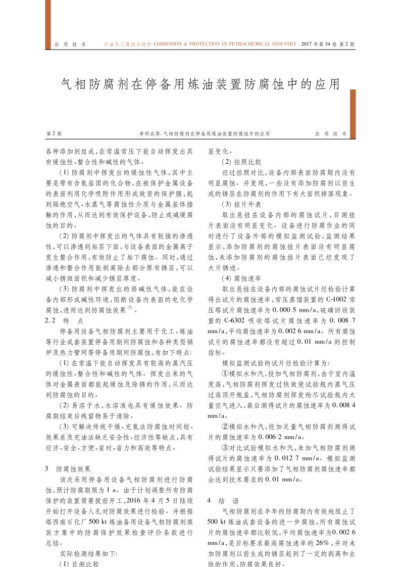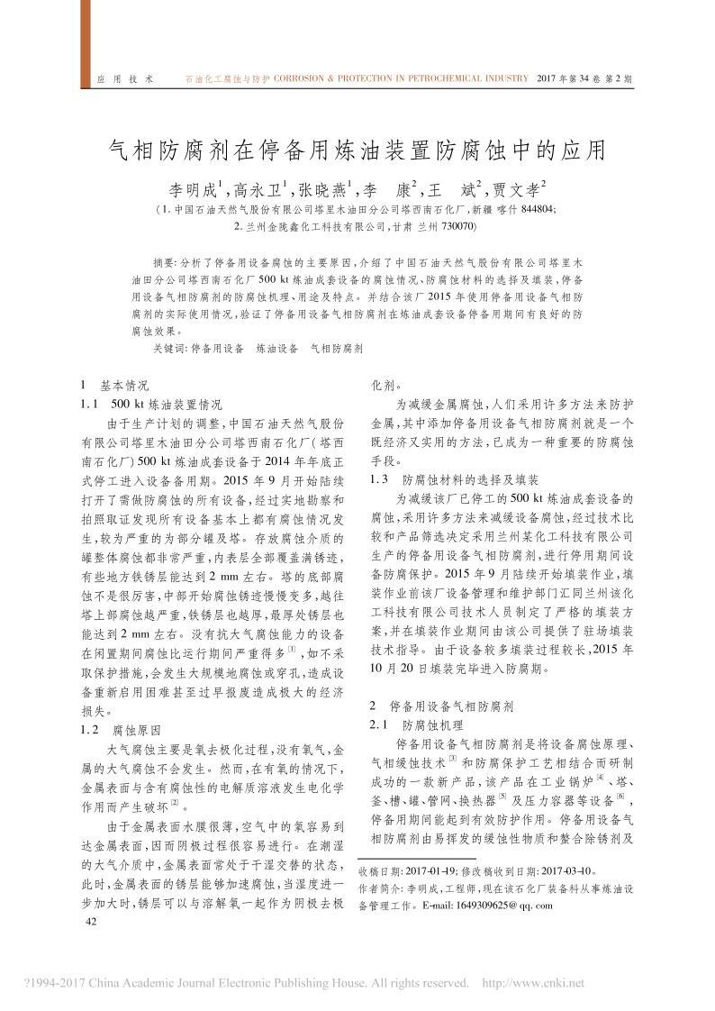 《停備用設備氣相防腐劑在停備用煉油裝置防腐蝕中的應用》文章正式出版