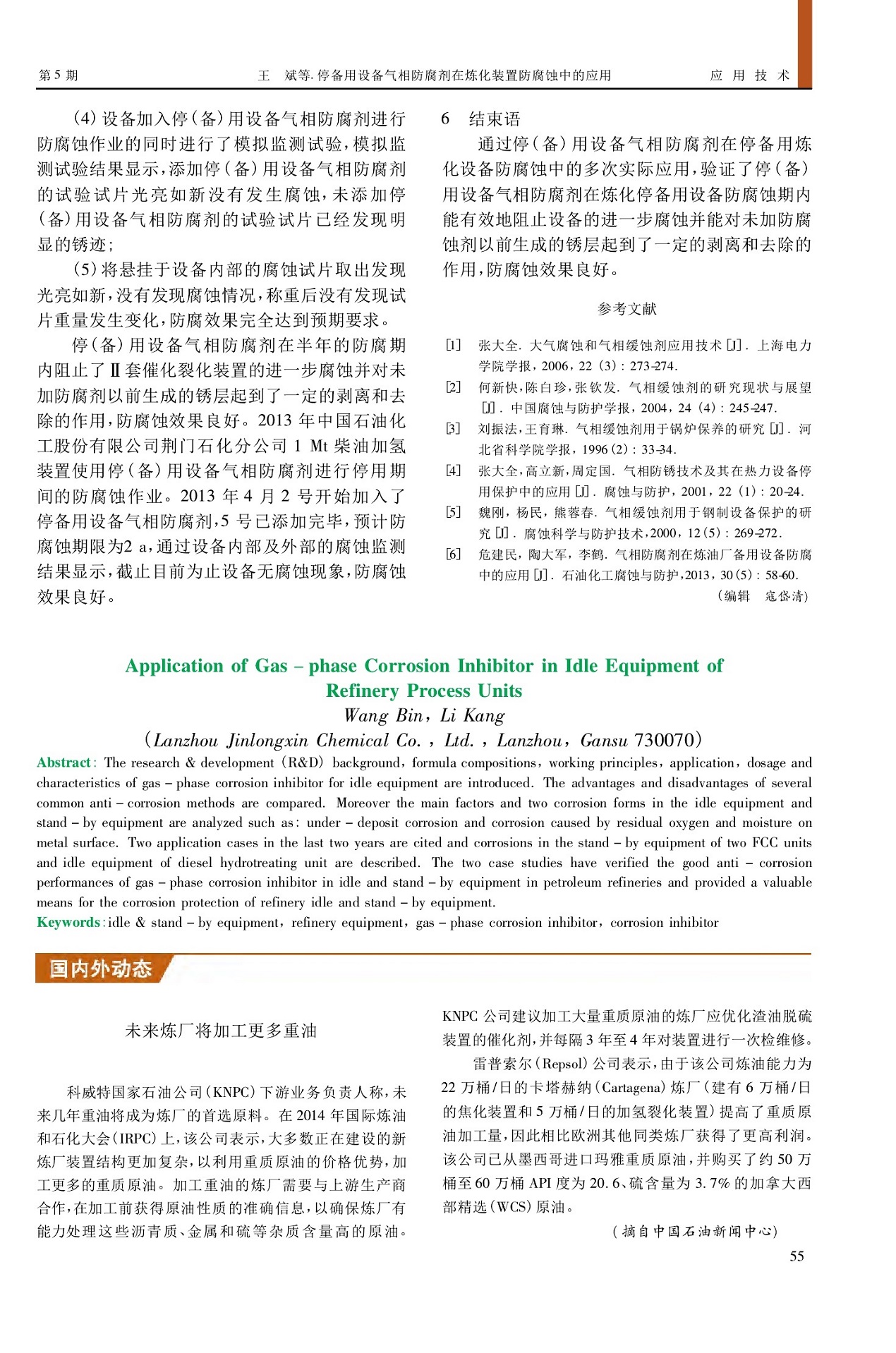《停備用設(shè)備氣相防腐劑在煉化裝置防腐蝕中的應(yīng)用》文章正式出版